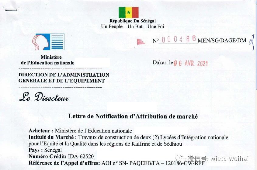 Recently, Société Zhengwei Technique Sénégal SARL (hereinafter referred to as Senegal Zhengwei) received the letter of acceptance from the Ministry of Education of Senegal notifying that Senegal Zhengwei won the bid for Sedhiou State High School Project. The project, located in Sedhiou Province in southern Senegal, is 385 km away from the capital city Dakar. The project consists of more than 20 single structures as well as outdoor engineering such as classrooms, student dormitories, a library, a dining hall, faculty dormitories, administrative buildings, etc., with a total building area of 16,800m2 and a contract value of more than US$ 10 million.