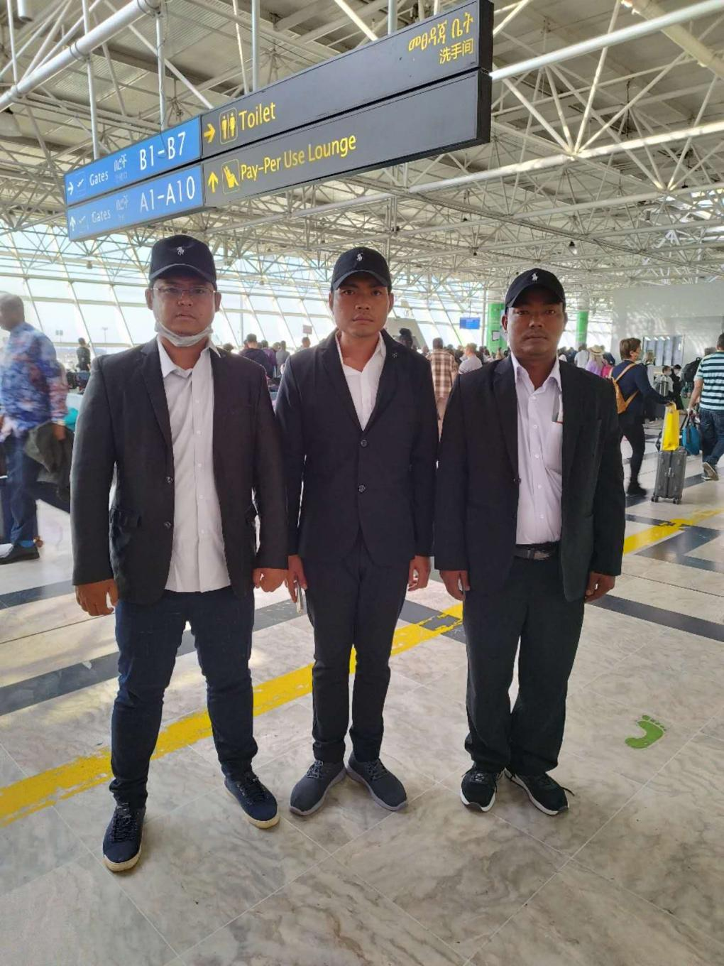Three Myanmar workers at Addis Ababa Bole International Airport in Ethiopia