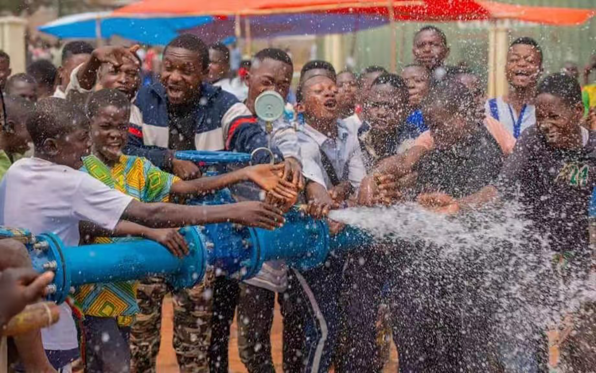 It was summer again in Kasai, and the sun was shining and warming the people on the earth. The children came out into the field and played football happily. When they get thirsty, they go to the water collection point for a drink. Look, how happy they are!