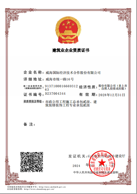 市政公用工程施工總承包貳級、建筑裝修裝飾工程專業承包貳級資質證書
