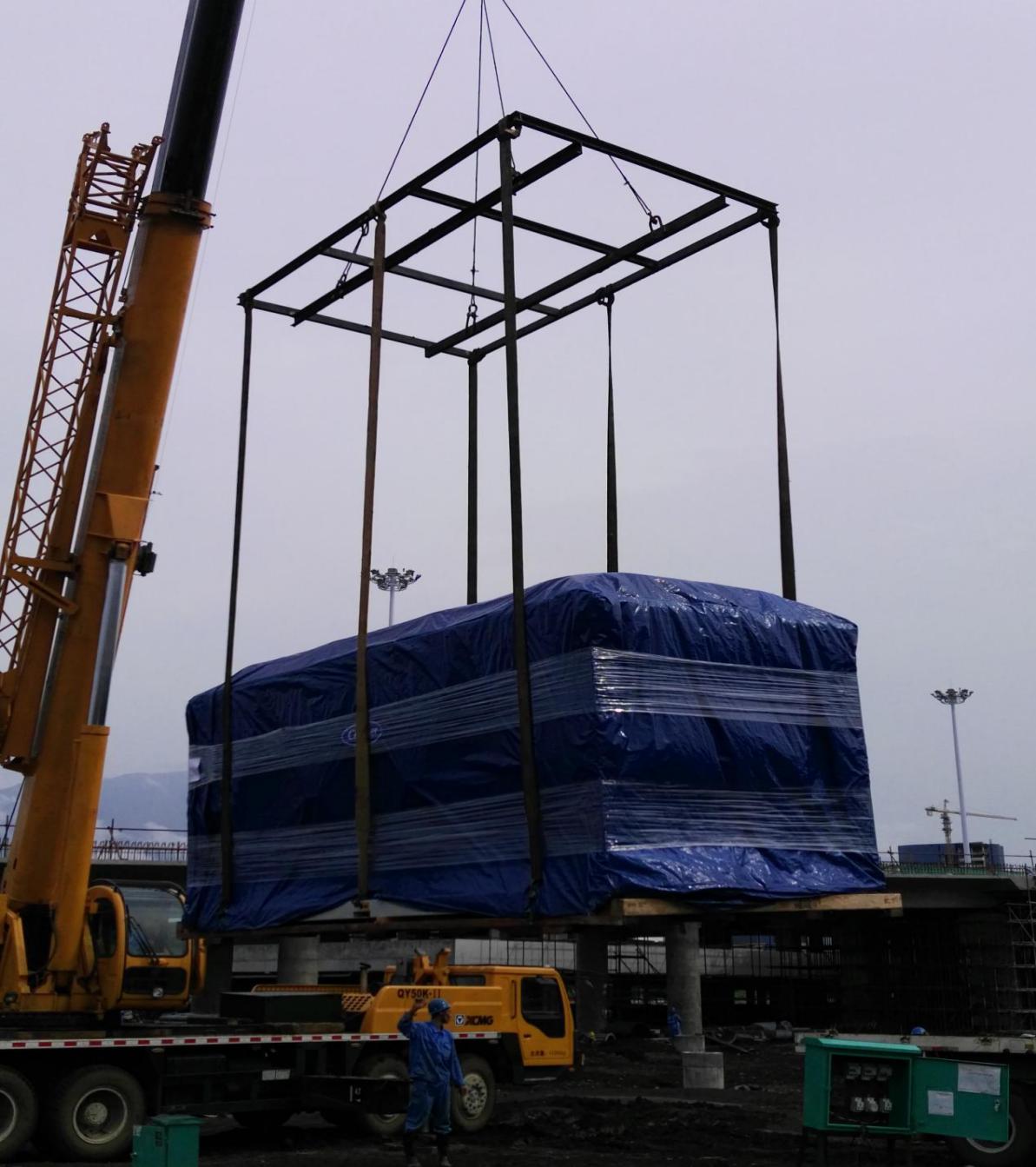 就在施工人員卯足了勁準備讓這16臺設備就位的時候,天卻下起雨來。為了搶工期,大家守候在現場,一邊等待雨停,一邊做一些必要的準備工作。天隨人愿,中午剛過就艷陽高照,員工們立刻行動起來,用鏟車把設備裝上拖板車,再由拖板車把設備運到安裝現場。等待在那里的一臺50噸吊車,小心翼翼地從拖板車上把一臺臺風冷設備穩穩地吊到已經提前澆筑好的設備基礎上。